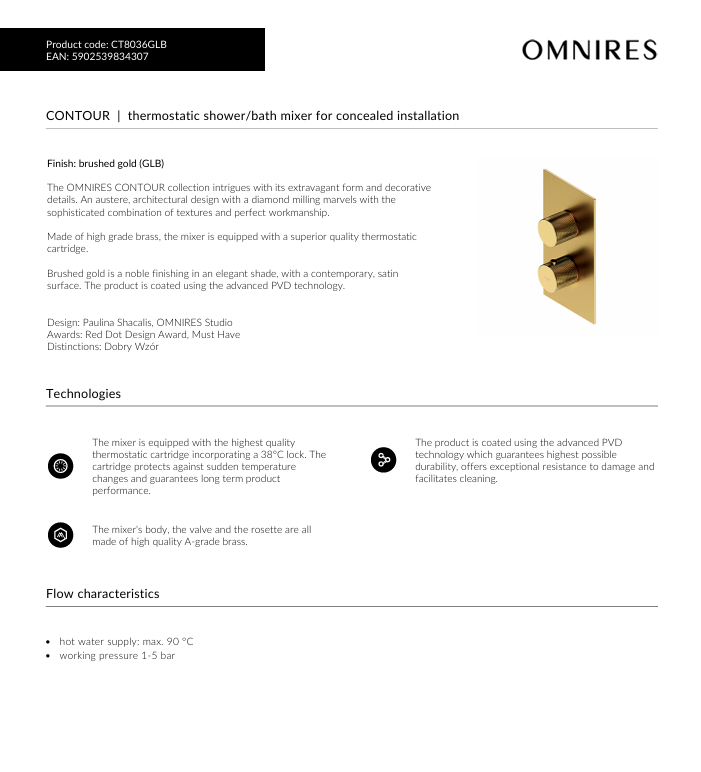 Made of high grade brass, the mixer is equipped with a superior quality thermostatic cartridge.