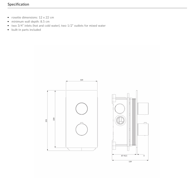 - two 3/4” inlets (hot and cold water), two 1/2” outlets for mixed water
