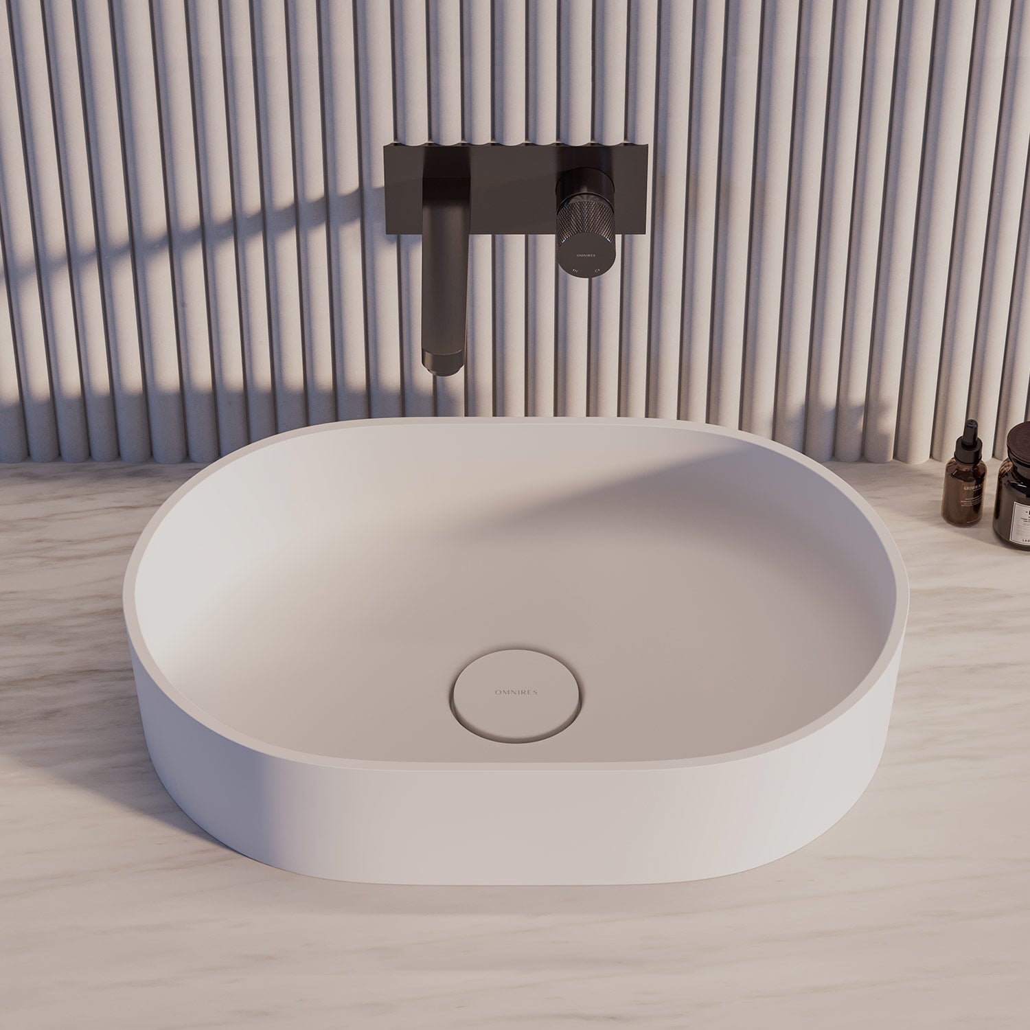 OVO M+ línan frá omnires hefur slegið í gegn í evrópu og víðar. Einstök hönnun og gæði frá hönnuðinum Paulina Shacalis. Það er ekki yfirfall á þessari handlaug, smellutappi fylgir með. 8 glæsilegir litir í boði