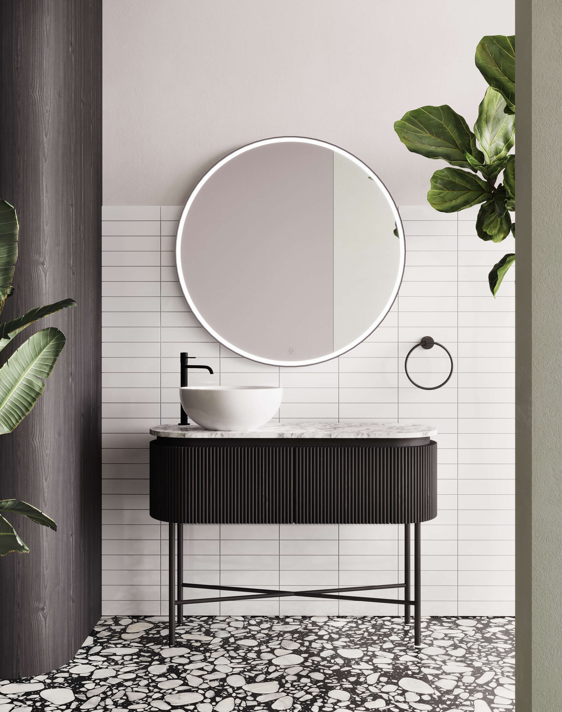 Einstaklega vönduð hönnun, svartur aluminium, rammi og festingar fylgja með. Led lýsing og hitari í speglinum til að koma í veg fyrir móðu.